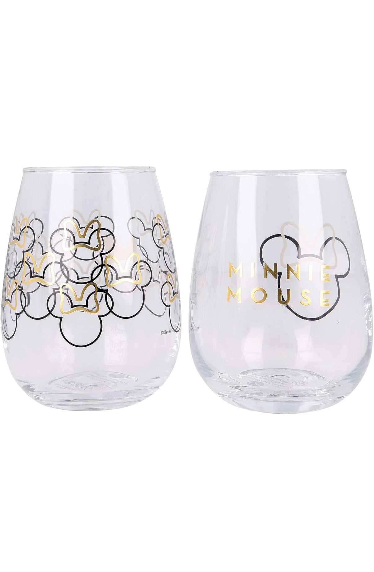 One glass showcases a repeating pattern of Minnie bows and outlines, while the other displays a bold, minimalist Minnie silhouette with a golden bow. Perfect for Disney fans of all ages, these high-quality glasses bring fun and elegance to any drink.